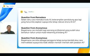 Diskusi yang berlangsung membuka banyak pertanyaan reflektif dari peserta—mulai dari keterampilan yang diperlukan agar tetap relevan di era AI, bagaimana cara mengadopsi dan belajar kembali bersama AI, serta memvalidasi jawaban yang dihasilkan oleh AI. Pertanyaan-pertanyaan ini menunjukkan bahwa transformasi AI pada akhirnya adalah proses pembelajaran berkelanjutan, bukan sekadar implementasi teknologi.